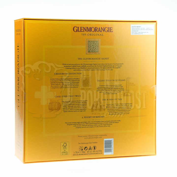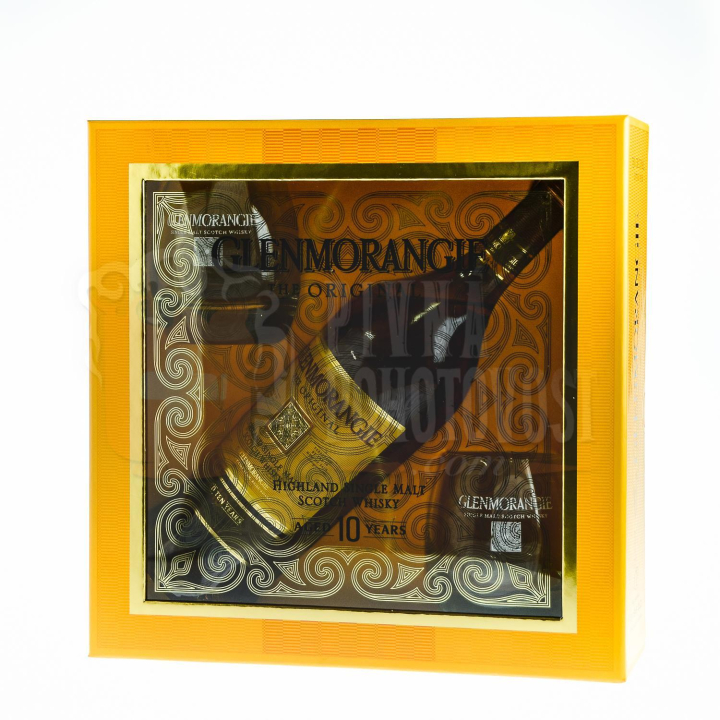Glenmorangie Original 10YO zreje plných desať rokov v sudoch po bourbone. Buket Glenmorangie je sadom zrejúcich citrónovníkov, marhúľ, jabloní, mandarínok a hrušiek. Môžete pocítiť nádych vanilkovej a banánovej zmrzliny s divokou mätou. Glenmorangie kladie dôraz na čistotu a kvalitu vody z vlastného prameňa Tarlogie Springs. Žiadna iná pálenica sa nemôže pochváliť vodou, ktorá je prirodzene destilovaná pôdou dlhšie než stovku rokov. Teraz v balení s 2 pohármi. Dizajn balenia je inšpirovaný kľúčovými symbolmi značky a predstavuje elegantnú krabicu s veľkým oknom odhaľujúcim fľašu a dva poháre. Zlatá tlač na obalovej fólii predstavuje emblém Signet (obraz vytvorený kmeňom Piktov, symbol značky).
