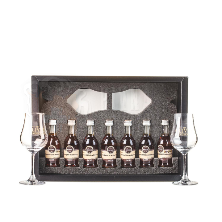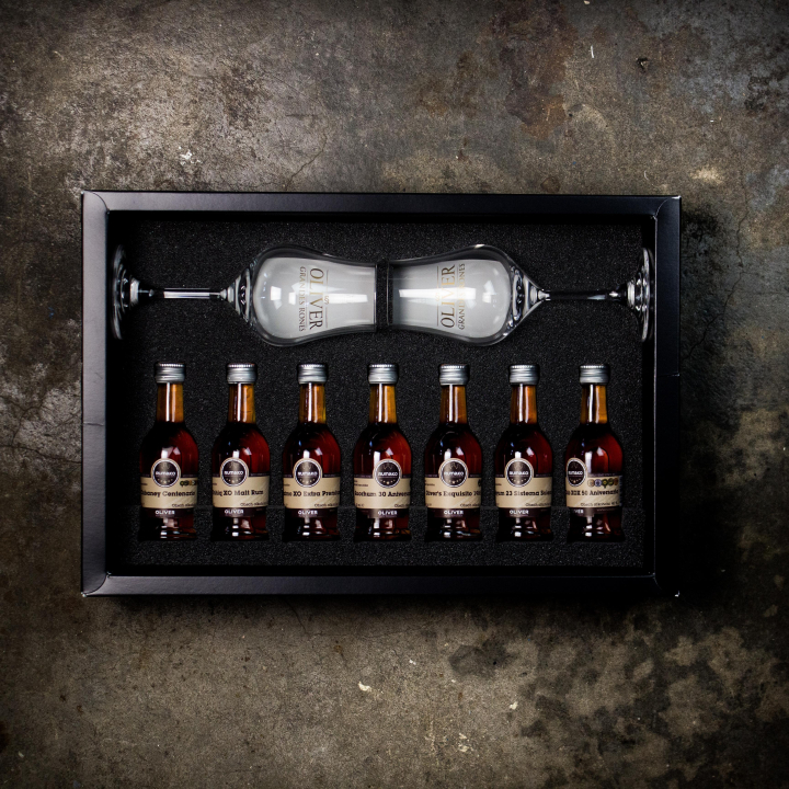 Set je zložený z tých najlepších rumov rodinného výrobcu Oliver & Oliver. Jeho história siaha takmer do polovice 19. storočia, kedy patriarcha rodu Juanillo Oliver začal na Kube vyrábať vyhlásený rum. Dnes následník rodu Pedro Ramon Lopez Oliver a jeho rodina produkujú tieto rumy v Dominikánskej republike, kam rodina utiekla pred revolucionárom Fidelom Castrom. Rodinná tradícia, použitie tých najkvalitnejších surovín a najmä starostlivo zostavený výrobný proces "Sistema Solera"vytvárajú rumy, ktoré sa oprávnene radia medzi svetovú špičku, čo dokazuje aj celý zástup významných medzinárodných ocenení. Napriek zrejmému Oliverovmu rukopisu je každý rum v tomto sete unikátny farbou, vôňou, chuťou a celkovým charakterom.