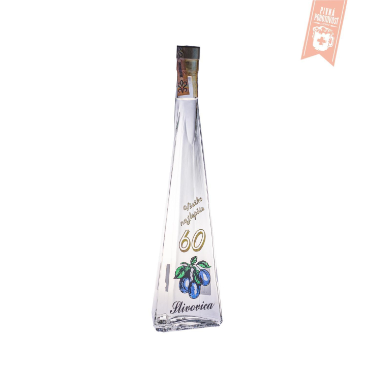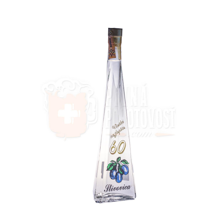 Bošácka Slivovica 52% v darčekovom balení v tvare ihlanu, ktoré je vhodné k dožitému jubileu 60 rokov.