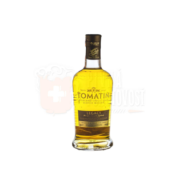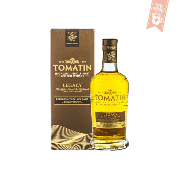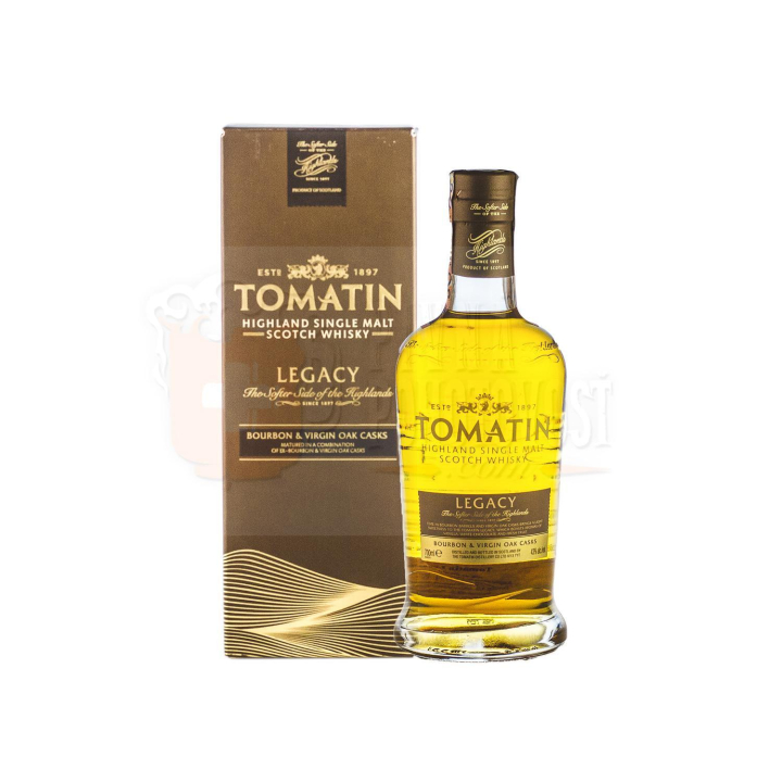 Tomatin Legacy je skvelá základná single malt whisky bez uvedenia veku od pálenice Tomatin. Zreje v kombinácii Bourbon a Virgin dubových sudov, čo prináša ľahkú sladkosť, vôňu vanilky, ibišteku, ananásu a citrónu. Na poschodí cítiť jemné tóny borovice, jabĺk a náznaky piškótovej torty, ktoré prechádzajú do čistého záveru. Jim Murray ohodnotil Tomatin Legacy v roku 2015 94,5 bodmi zo 100.
