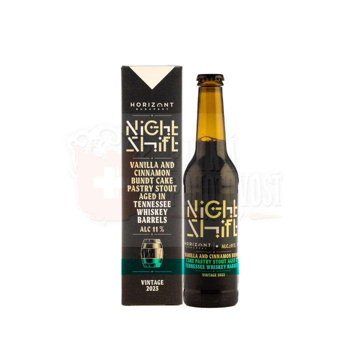 Horizont Night Shift 2023 je exkluzívny Imperial Pastry Stout, ktorý svoje neopakovateľné chuťové nuansy získava dozrievaním v sudoch po Tennessee Whiskey. Tento tmavý stout je obohatený o vanilku a škoricu, čo mu dodáva charakter typického Bundt koláča.