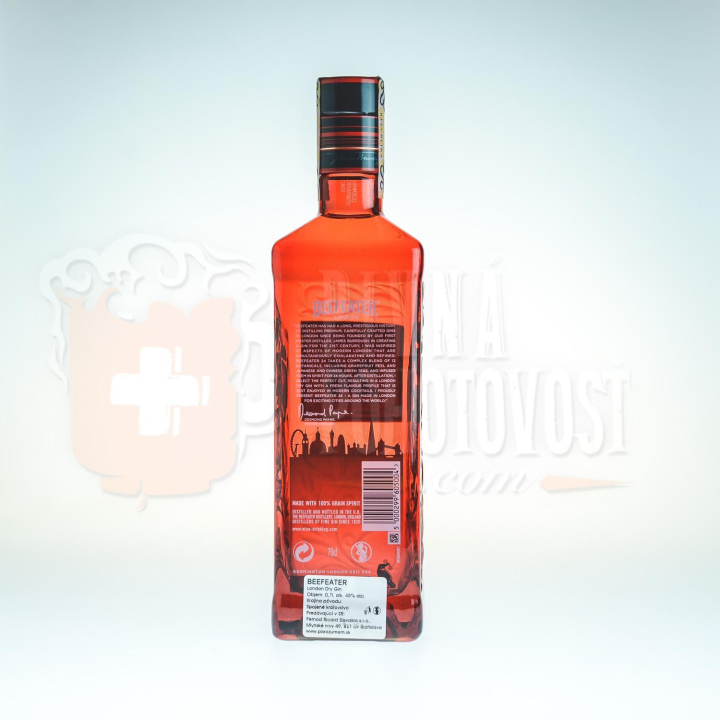 Beefeater je jediný gin, ktorý sa vyrába priamo v Londýne.Osviežujúci, čistý a zároveň ostrý gin s nepatrným nádychom citrusov a ovocia, vyvážený chuťou korenia.Je výborným základom pre rôzne koktaily.Vysoko kvalitný gin Beefeater je jediné prémium London Dry Gin, ktorý destiluje v Londýne.Vytvoril ho farmaceut James Burrough v roku 1820 a nazval ho podľa strážcov londýnskeho Toweru.Chuť ginu je veľmi čerstvé, suchá a citrusová, vyvážená tónmi karamelu.Farba je jasná a čistá v bezfarebnej fľaši.Vyrába sa z čistého obilného alkoholu a destiluje sa výhradne s prírodnými rastlinnými ingredienciami.