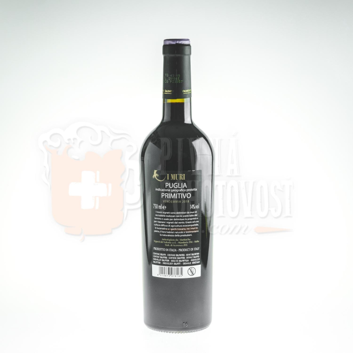 Vigneti del Salento I Muri Puglia má plnú tmavo rubínovú farbu s fialovými odleskami. V bukete dominuje intenzívna aróma sliviek a čerešní.Toto primitivo sa na podnebí prezentuje trochu pikantným charakterom s náznakom rozmarínu a vanilky. Víno má plné telo je vyvážené so silnou dochuťou. Vychutnajte si toto krásne primitivo s Puglie k pečenému mäsu alebo plným zrelým syrom.