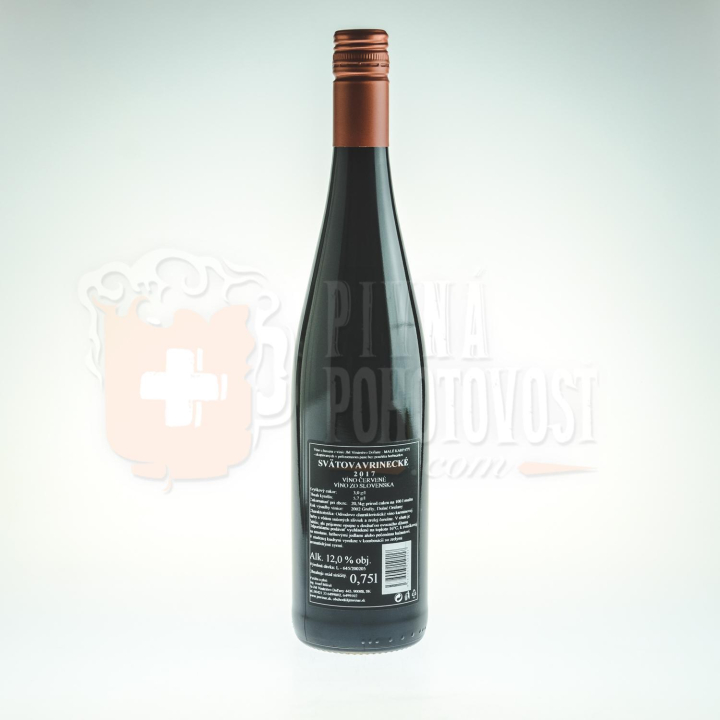 Alkohol %: 12% Balenie: Bez obalu Cukornatosť: suché Objem: 0,75 Oblasť: Malokarpatská Odroda: Svätovavrinecké Ročník: 2017 Krajina: Slovensko Farba: červené