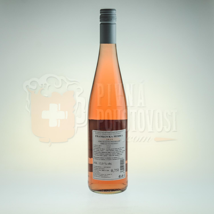 Alkohol %: 12% Balenie: Bez obalu Cukornatosť: Polosuché Objem: 0,75 Oblasť: Malokarpatská Odroda: Frankovka modrá Ročník: 2019 Krajina: Slovensko Farba: Ružové